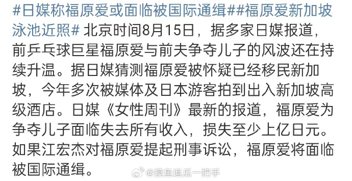 日媒《女性周刊》最新的报道,福原爱为争夺儿子面临失去所有收入,损失至少上亿日元。如果江宏杰对福原爱提起刑事诉讼,福原爱将面临被国际通缉。 那么,就是离个婚,为什么福原爱会被国际通缉呢?