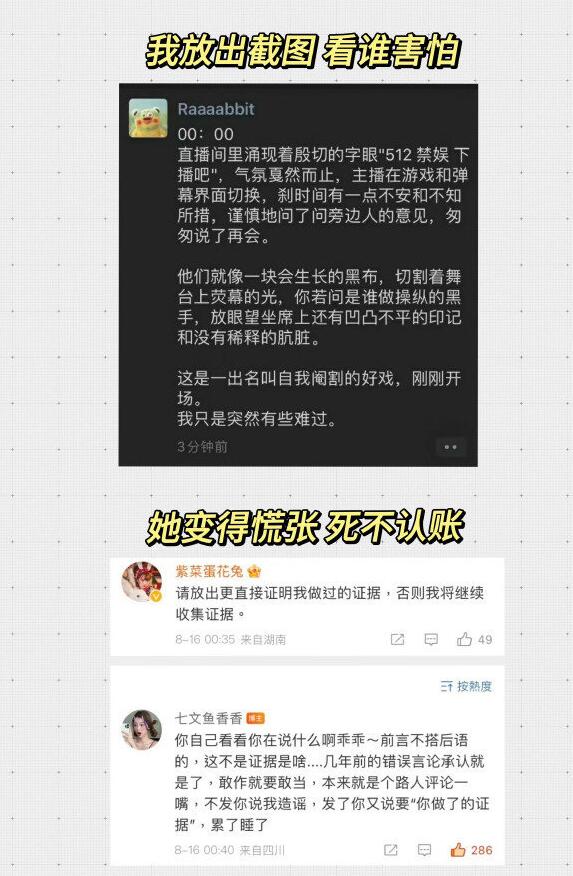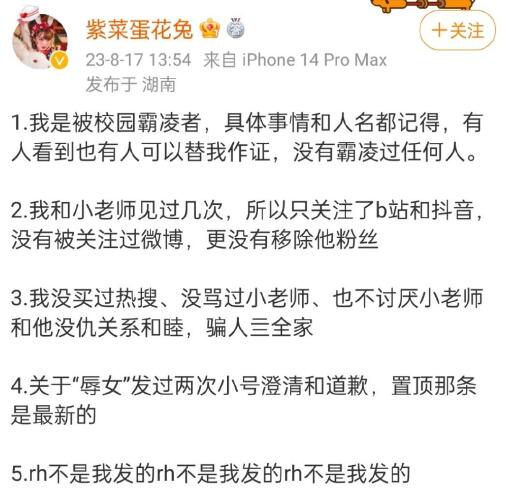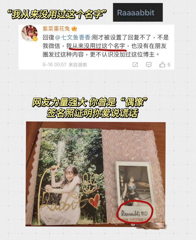 ![]() 这次事件,直接导致紫菜蛋花兔的不少黑历史被扒出来,比如说她曾经校园霸凌,然后还在512的时候内涵“禁娱日”,一个叫“七文鱼香香”的网友分享了当年紫菜蛋花兔在朋友圈内涵512禁娱日的内容,当时紫菜蛋花兔的名字叫“Raabbit”: ![]() 对于这个512内涵的证据,紫菜蛋花兔不承认,说自己从来没有用过“Raabbit”这个名字,不过广大的网友立刻分享了紫菜蛋花兔当年给自己的签名,上面赫然写着:“Raabbit”,不得不说。 ![]() 目前已知的紫菜蛋花兔的黑历史其实都在她自己的回应里面了,包含霸凌、rh、辱女等等。 ![]() |
