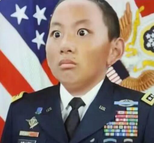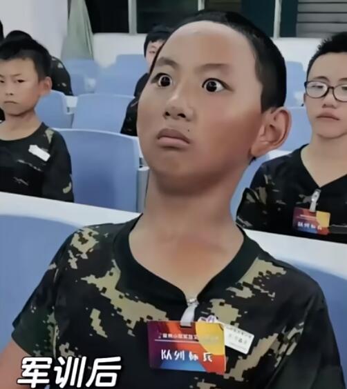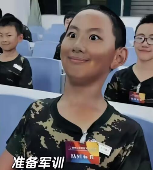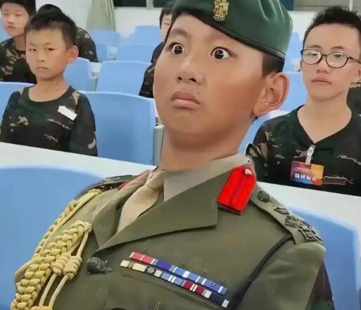这位小朋友身姿挺拔,表情认真,眼睛瞪得像铜铃,严肃中透着搞笑,被网友们称为是夏令营兵王,并创作了各种改图和段子。