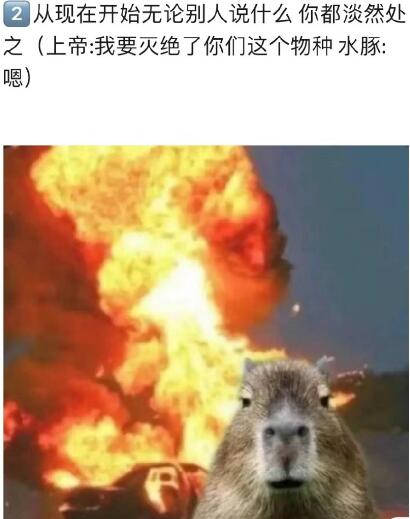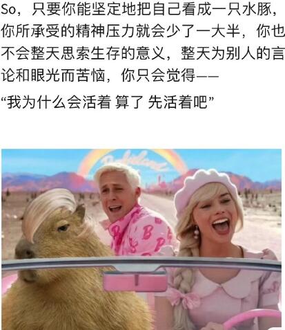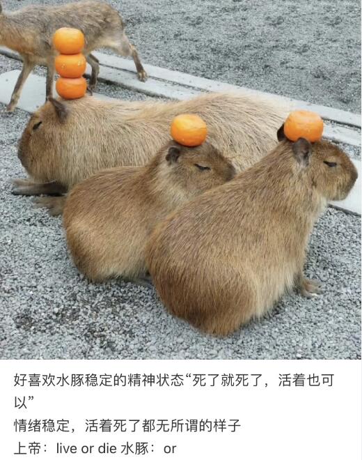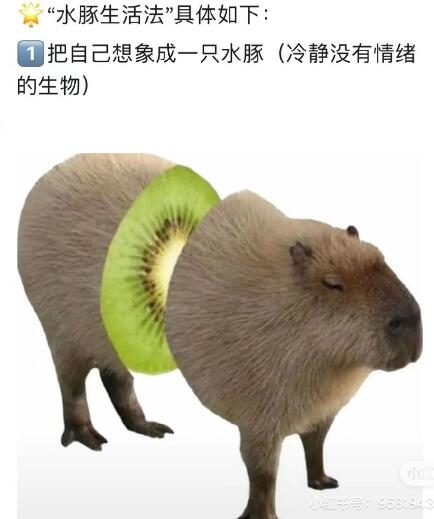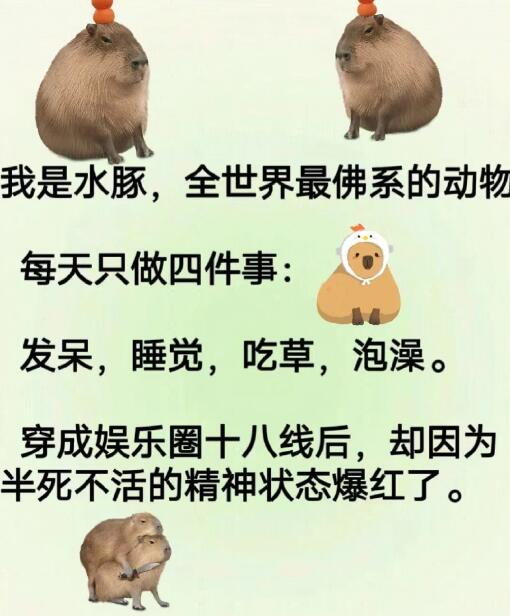 “水豚精神”该更指的是当代网友发现自己的精神状态又有了新变化,感觉似乎要变成一只卡比巴拉,也就是水豚啦。水豚安逸温顺,讲究的就是一个“死了就死了,没死就活着”的态度。