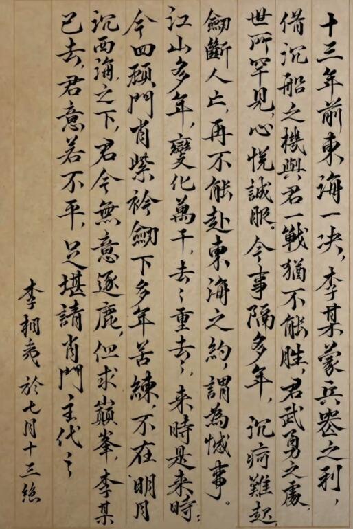 十三年前东海一决,李某蒙兵器之利,借沉船之机与君一战犹不能胜,君武勇之处,世所罕见,心悦诚服。今事隔多年,沉疴难起,剑断人亡,再不能赴东海之约,谓为憾事。