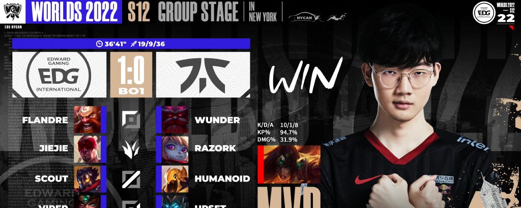 2022英雄联盟全球总决赛·小组赛,EDG合创汽车 1:0 FNC(BO1,EDG蓝色方),本场比赛,由EDG合创汽车取得胜利,MVP给到输出拉满的Viper选手!