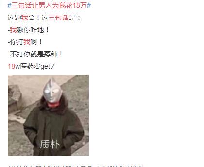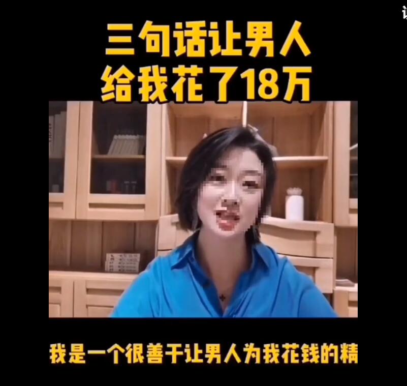 近日,很多短视频平台出现了一个类似的段子“三句话让男人为我花18万”,视频里的女主播称自己是一个很善于让男人为自己花钱,精通人性的女讲师,第一餐饭就吃了十多万,一个红包就转了几万,但到视频的最后也没说出她们到底说了哪三句话!