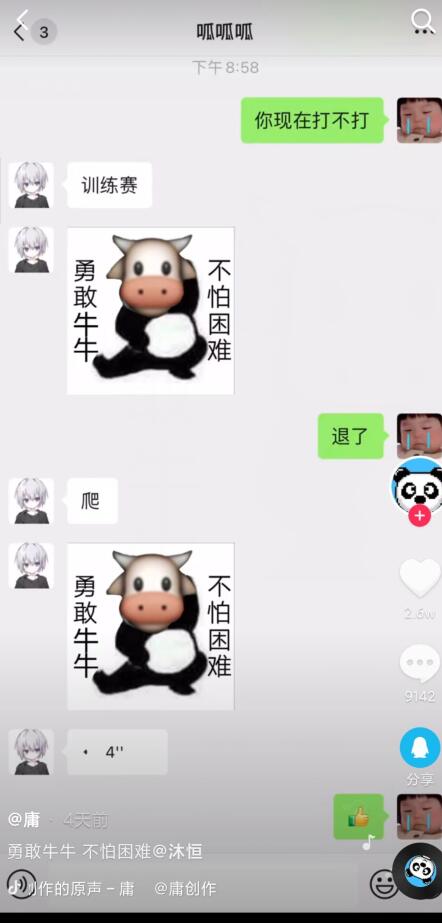 视频中,有朋友在群聊发了一张勇敢牛牛不怕困难的表情包,随后用洪荒之力喊出语音:“勇敢牛牛!不怕困难!”,疑似是一种激励的方式,听上去十分振奋人心,充满正能量,也非常的洗脑,不少抖音博主火速跟风翻拍出了各种版本,勇敢牛牛不怕困难因此成为了一个梗。 ![]() 后来还延伸出了“勇敢狗狗!不怕困难!”“勇敢猪猪!不怕困难!”等等 ![]() 在遇到困难时,也许我们正是需要这种简单但十分有效的激励吧! |