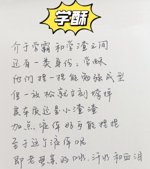 简单来说,“学酥”就是骨子里是学渣,但是靠着外在人的鞭策成为学霸的人。