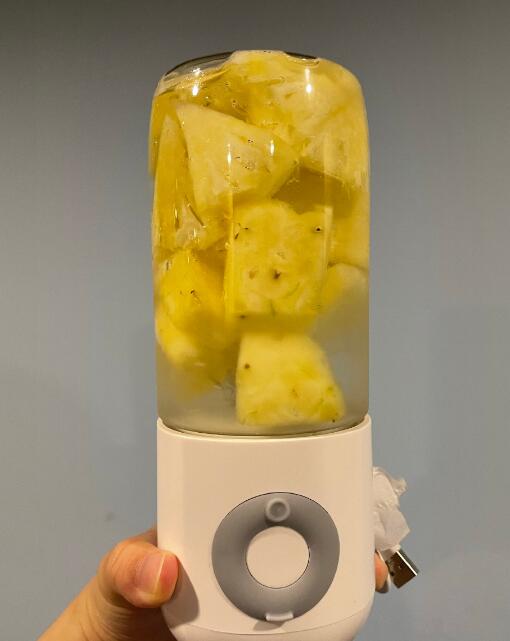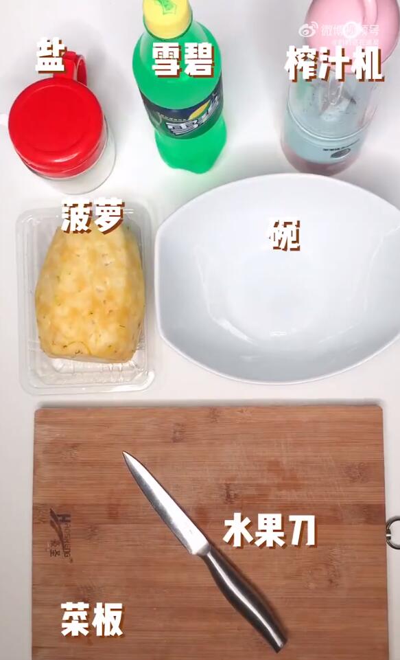 “菠萝能宿”的做法:菠萝切块,加水放盐浸泡五分钟,放入榨汁机,加入半杯雪碧,加入冰块,夏天热的时候喝能胃疼,疼一宿。