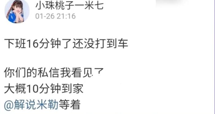 在21年的时候,米勒等一众解说在二路连麦解说比赛,但是因为比赛打满了,导致米勒连接老婆小珠桃子下班的事都给忘了,于是其他解说就在调侃说:“不会一会儿就看不到米勒了吧”。然后米勒就非常硬气的表示,不能惯着老婆,让她自己打车回家。