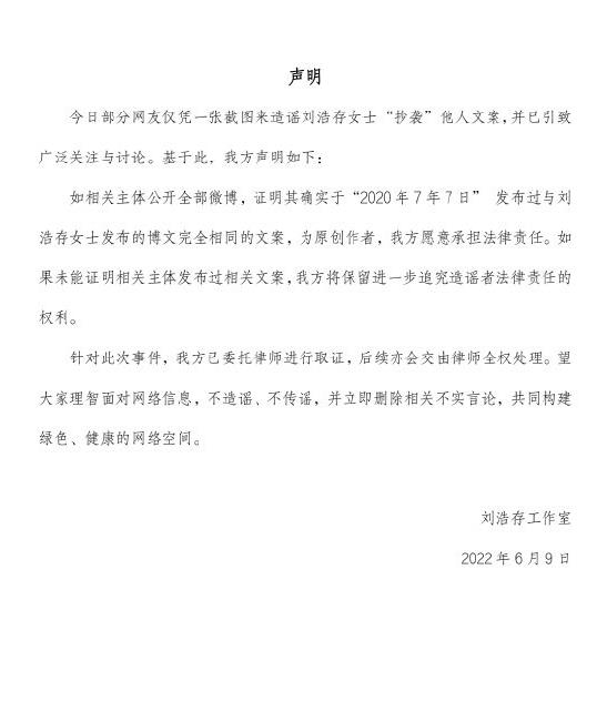 下面是刘浩存发的文案 ![]() 下面则是2020年7月7日,所谓的被刘浩存抄袭的文案源头 ![]() 看的出来,这两篇微博内容真是一模一样,如果是真的,那么抄袭是必须的了!但是目前刘浩存方面表示没有抄袭,还发了律师函: 称:“如相关主题公开全部微博,证明其确实于2020年7月7日发布过于刘浩存女士发布的博文完全相同的文案,为原创作者,我方愿意承担法律责任。” ![]() 在刘浩存声明的微博下,大量网友还是在黑刘浩存以前的事,也就是刘浩存妈妈的培训班,在给一个小朋友下腰的时候,将小女孩弄瘫痪的事件。 具体事件来龙去脉可以参考:http://www.96845.com/article/2022/713.html |