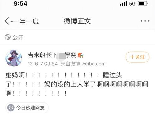 “错过高考神帖”出自博主@吉米船长 在2012年高考当天发布的一条搞笑博文,原文就是吐槽自己高考睡过头。