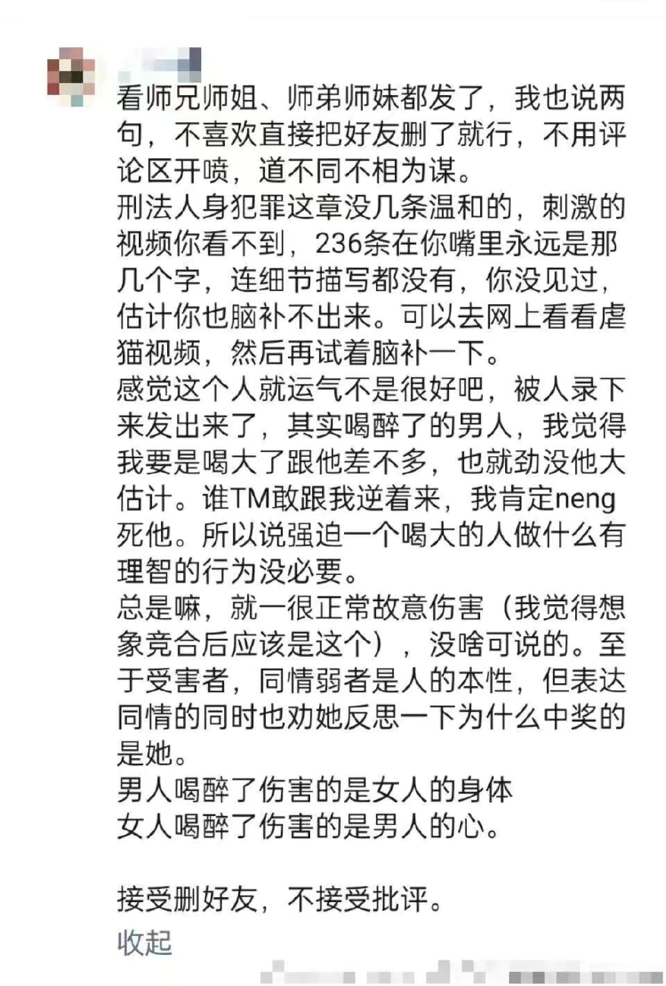 这2天唐山打人事件令网友们非常气愤,舆论也是一边倒的指责打人者,但是在此期间也有不太和谐的声音,甚至有西南政法大学的学生为打人者开脱,发表了不恰当的言论,内容如下: