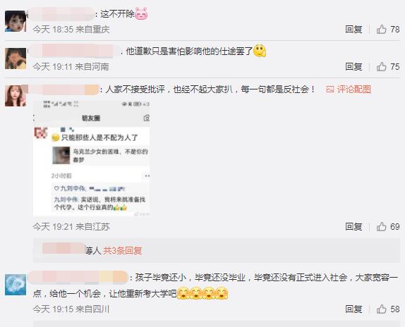 ![]() 针对该同学的上述言论,西南政法大学官方微博第一时间做出回应称: 情况通报:6月10日,我校法学院学生刘某因在互联网就“唐山烧烤店打人事件”发表不当言论,造成不良影响。鉴于刘某能主动承认错误,检查认识深刻,本着教育与惩戒相结合原则,根据学校学生违纪处分办法相关规定,经研究决定,给予刘某警告处分。学校将举一反三,加强学生教育管理,维护网络文明。 有网友还发现,该刘某此前还发表过多次不当言论。 ![]() |