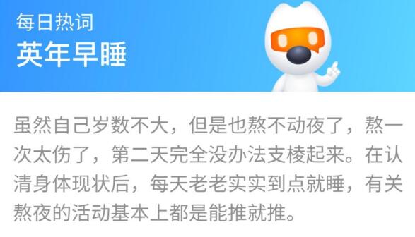 “英年早睡”源于成语“英年早逝”。古往今来,有不少享有极高成就的人英年早逝,而这个往往和他们不规律的睡眠关系极大。因此,当代网友们常常互相勉励,彼此一定要好好休息,尤其是每天要面对各种工作的打工人,劳身劳心的更应该早点睡觉,英年早睡。及时告诫年轻人们,健康最重要。