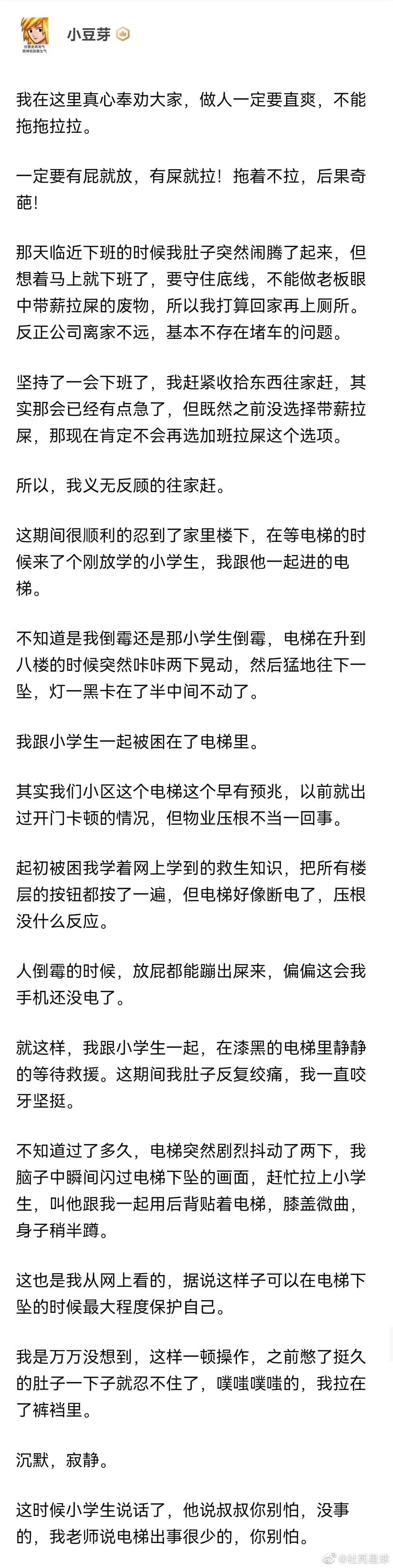 “叔叔你别拉了,我害怕”该梗出自一个大型社死事件,网传是发生在2021年4月的山西某小区,某男子临下班突感腹中不适,但因为着急回家,就想着回到家中再解决。路上一切都很顺利,谁料楼中电梯年久失修,男子居然被困在了电梯里。同时被困在电梯里的还有一名小学生,直到两人不知所措时,电梯又剧烈摇晃起来,吓得男子赶紧屈膝半蹲,这是网传当电梯下落时,最能保护自己的姿势。结果他刚一蹲下就一泻千里,怎么憋都憋不住,旁边的小学生都被他吓哭了,直到被营救时都在喊,叔叔,你别拉了,我害怕。不出意料的男子在小区出名了,连报纸都报道了,他在电梯里被吓出翔的故事。但离谱的是,小区物业迫于舆论压力,很快的更换了新电梯,男子居然成了当地有名的维权斗士。甚至有业主愿意聘请他去自己的小区电梯拉,总之男子算是因祸得福了。
