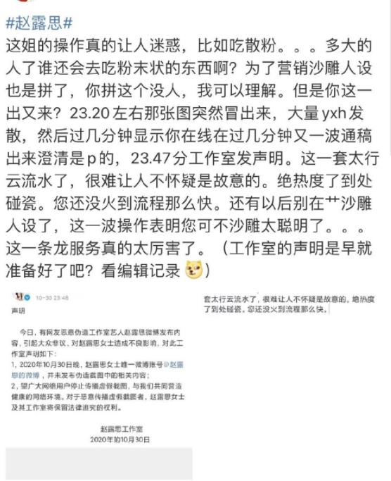 辟谣声明后,由于发布过于迅速,有人开始怀疑赵露思是自导自演的(如图,这是很多吃瓜群众并不知道的),并进行谩骂。