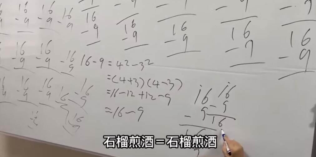 “石榴煎酒”是“16-9”的谐音,出自一位老奶奶做数学题的视频,因为做了半天依然得出“16-9”好似卡bug一样,网友见了纷纷表示“这过程太洗脑了吧!我这些年的学算是白上了”。