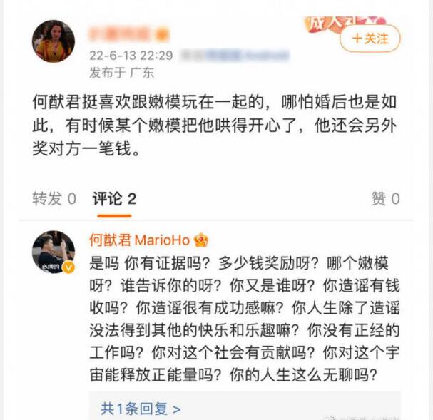 而最近网上出现了一则案例,有人爆料赌王的小儿子何猷君在婚前婚后都喜欢跟嫩模一起玩,结果此番言论直接引来何猷君本尊的回复“是吗 你有证据吗?多少钱奖励呀?那个嫩模呀?谁告诉你的呀?你又是谁呀?你造谣有钱收吗?你造谣很有成功感嘛?你人生除了造谣没法得到其他的快乐和乐趣嘛?你没有正经的工作吗?你对这个社会有贡献吗?你对这个宇宙能释放正能量吗?你的人生这么无聊吗?”