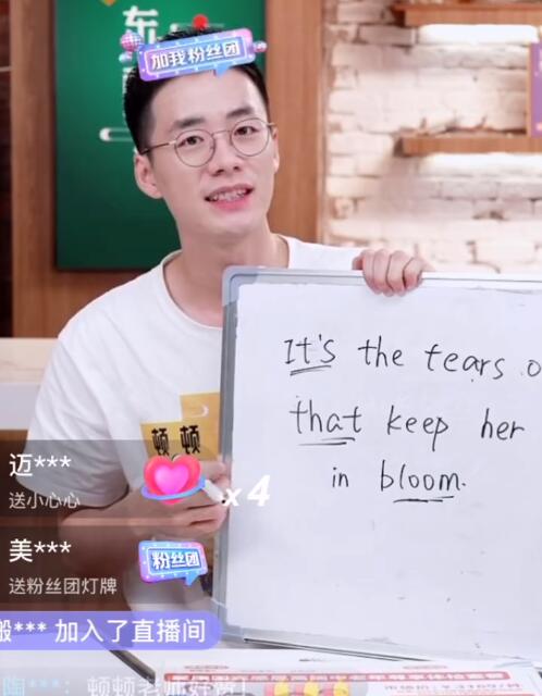 顿顿老师是新东方直播间里的老师,他是继董老师之后的又一个宝藏老师。顿顿老师的风格跟董宇辉老师的风格完全不同,他是那种文质彬彬、娓娓道来、轻声细语型的男生,有网友说:“终于知道为什么电视剧里女妖精都喜欢这种“书生”了,听着听着就入迷了! 谦谦公子温润如玉东方直播间真的是宝藏啊!”