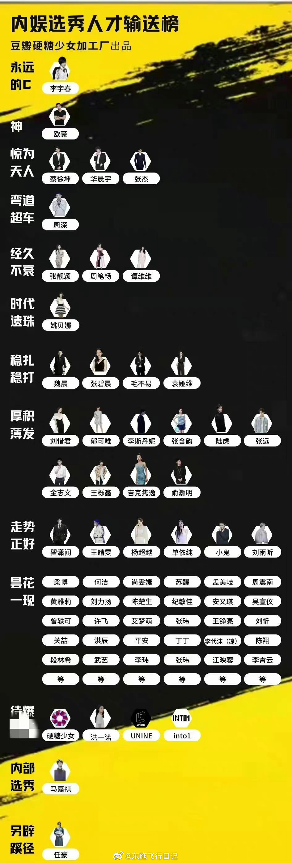 最近,微博上各种榜单层出不穷,有一份“内娱选秀人才输送榜”很有亮点,上面的神之欧豪和任豪另辟蹊径仿佛点睛之笔,欧豪的神主要还是因为海清那句“你是我的神”(详情:http://www.96845.com/article/2022/541.html);而说任豪“另辟蹊径”则是调侃任豪靠“塌房”爆红,任豪在娱乐圈是有名的“六边形塌房战士”,意思是说他塌房是全方位的无死角的(详情:http://www.96845.com/article/2022/678.html);每次塌房之后,他的粉丝会安慰大家,下次就好了,可是等任豪下次再塌房,保证换一个新花样!