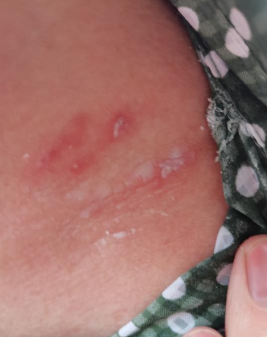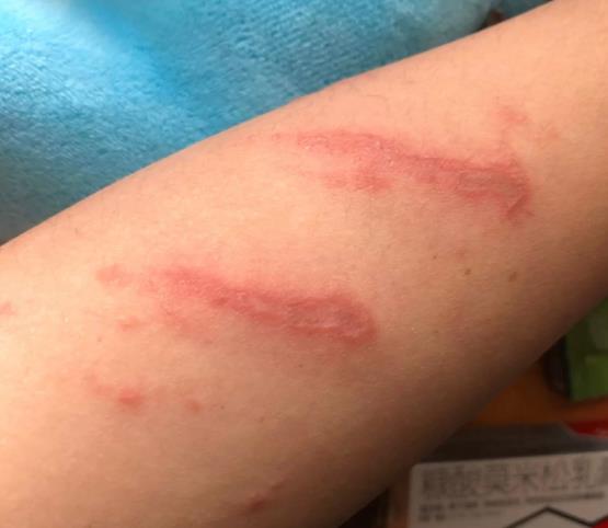2、被隐翅虫咬伤后皮肤会出现点状、片状或条索状红斑,随后中央呈灰褐色坏死。若受伤面积不大,会有轻微痒痛感;若受伤面积较大,则会有强烈痒、痛感觉,可能伴随淋巴结肿大,发烧等。