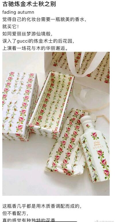 “秋之别”是古驰推出一款香水的名字,包装灵感来自于古老的炼金术士文化,仿佛中世纪的药剂瓶,精致的玫瑰花蕾烤漆印花非常gucci。味道是木质香调,雪松和广藿香的交织一秒把人带入午后三四点金色阳光照射的秋日公园,落叶铺满地,踩上去还会发出嘎吱嘎吱的声响。在一众木质香里属于清新细腻,后调慢慢嗅见檀香的味道,整个香气变得完整有层次。但无论它的包装多么精美,味道多么美腻,作为客家人是很难去入手的。