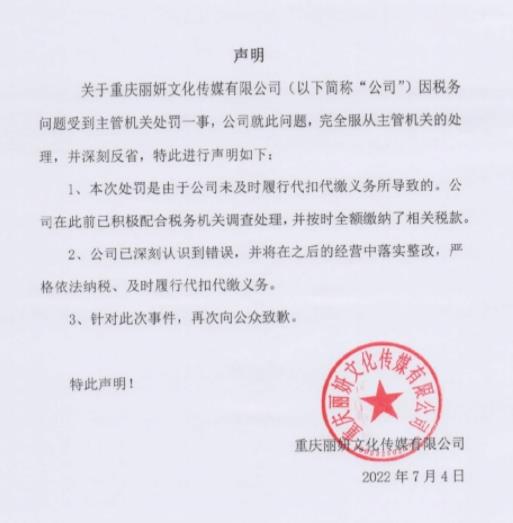 6月13日,袁冰妍关联公司重庆丽妍文化传媒有限公司因偷漏税被罚97.8万元,具体事由为:2019-2021年期间,该公司以企业资金为股东本人支付与企业生产经营无关的消费性支出,共计815万元。上述支出应视为企业对个人投资者的红利分配,依照“利息、股息、红利所得”项目计征个人所得税,适用税率为百分之二十。作为扣缴义务人,重庆丽妍公司应代扣代缴个人所得税163万元,但该公司未履行代扣代缴义务,违反了《中华人民共和国税收征收管理法》。因此,国家税务总局重庆市税务局第七稽查局拟对重庆丽妍上述行为处应扣未扣、应收未收税款60%的罚款,即97.8万元。