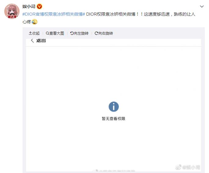 ![]() 值得一提的是,袁冰妍被爆出相关争议之后,DIOR官博就把刚刚发布的袁冰妍相关内容给权限了,无法显示,其实偷税这种行为跟金额大小没关系,至于会不会封杀,我们看后续报道吧! ![]() |