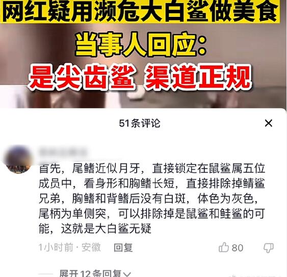 对此,中国渔业协会原生水生物及水域生态专业委员会主任委员周卓诚称:“提子”视频中的鲨鱼的确为噬人鲨,也称大白鲨,是国家二级保护动物。