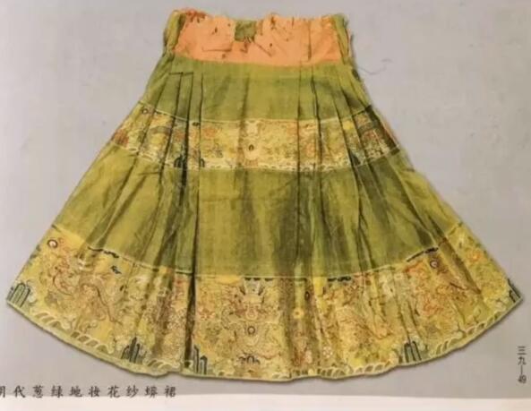 在山东曲阜孔府旧藏的服饰文物里,就有不少的马面裙。比如下面这件明代葱绿地妆花纱蟒裙,就是典型的代表。