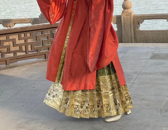 除了裙门多褶多之外,马面裙还有一个突出的特征就是裙摆宽大。并且在膝盖和下摆的部分还会织绣寓意吉祥的美丽纹样,也就是俗称的膝襕和底襕。这样的设计让马面裙更显得端庄贵气,成为了汉服同袍里不少大明富婆最爱的款式。