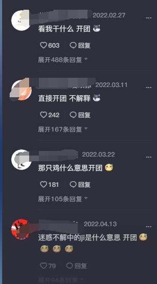 当评论区中有人说“开团”,就是让大家把同一个人的表情包发送出来,接受网友们的嘲讽。