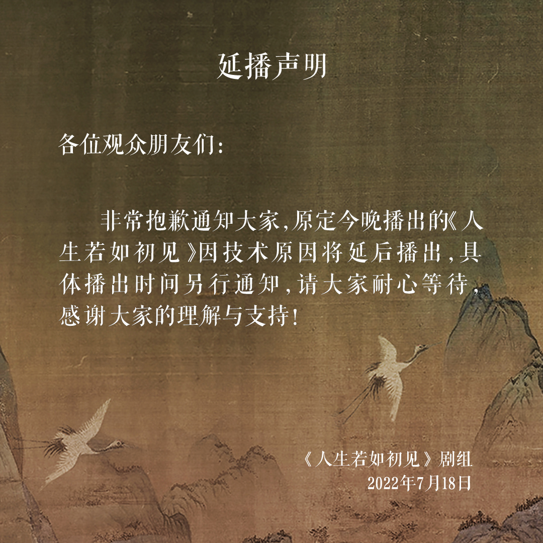 2022年7月18日晚,人生若如初见爱奇艺播出,上线6集后又下线,只剩下预告。随后@人生若如初见官微发布延播声明:“原定今晚播出的《人生若如初见》因技术原因将延后播出,具体播出时间另行通知,请大家耐心等待,感谢大家的理解与支持。”