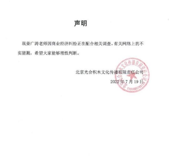 姜广涛被抓?因商业经济纠纷正在配合相关调查