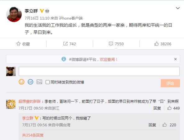 因此这次的采访风波后,李立群老师暂停了抖音的更新。李立群出生在台湾省,他的父母都是内地人,相信李立群老师对两边都有深厚的感情。在7月16日的时候,他发微博称:“我的生活我的工作我的成长,就是典型的两岸一家亲,期待两岸和平统一的日子,早日到来。” 他还在微博中恢复网友说:“他们的问话(采访)让我掉坑里了,说的话就变味了。” ![]() |