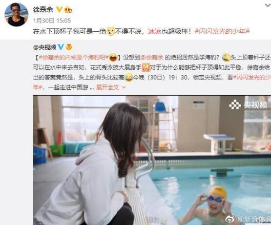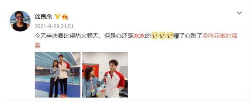 徐嘉余更是多次在微博中玩谐音梗,表白冰冰“半决赛里的热火朝天,但是心还是冰冰的,糟了,心跳了”。