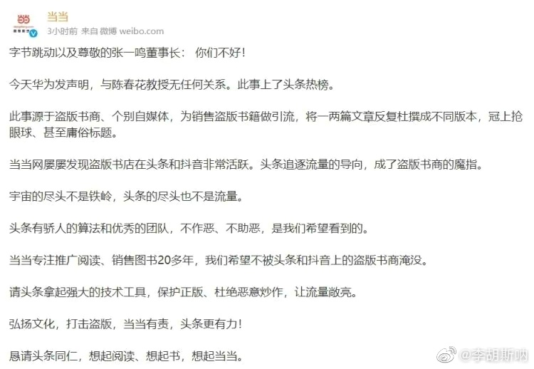 ![]() 陈春花和华为事件的来龙去脉简单来说如下: 第一、大量自媒体在短视频平台上,以陈春花的名义写了大量关于对华为的解读。陈春花曾于2017年1月发表的文章《与任正非先生:围炉日话》,但多年来,文中大量细节被各类自媒体不断演绎、夸大,演变出了“华为军师陈春花”、“任正非亲自开车接陈春花,却遭对方直言:你的企业马上面临亏损”等等。 第二、随着自媒体上这类文章传播面广泛,播放量巨大、影响力巨大,华为方面亲自出来回应称:近期网络上有1万多篇夸大、演绎北京大学国家发展研究院北大未来教育管理研究中心负责人陈春花教授对华为的解读、评论,反复炒作,基本为不实信息,“华为与陈春花教授无任何关系,华为不了解她,她也不可能了解华为。” 第三、在华为做出回应后,陈春花也迅速回应:“近期网络上有逾万篇夸大、演绎我对华为的解读、评论,基本为不实信息。正式声明:1、这些文章不是我写的。2、华为仅为我的学术研究案例之一。3、我将聘请律师就此类侵权行为追究责任。” 而当当网也发微博,直指本次事件的核心:“当当网星期三晚上针对此事指责字节跳动创始人张一鸣“不好”,称上述事件源于盗版书商、个别自媒体,为销售盗版书籍做引流,公司屡屡发现盗版书店在头条和抖音非常活跃。头条追逐流量的导向,成了盗版书商的魔指。” 然后随着事件的继续发酵,陈春花的学历也被网友给扒出来了,就出现了开头的一幕。 ![]() |