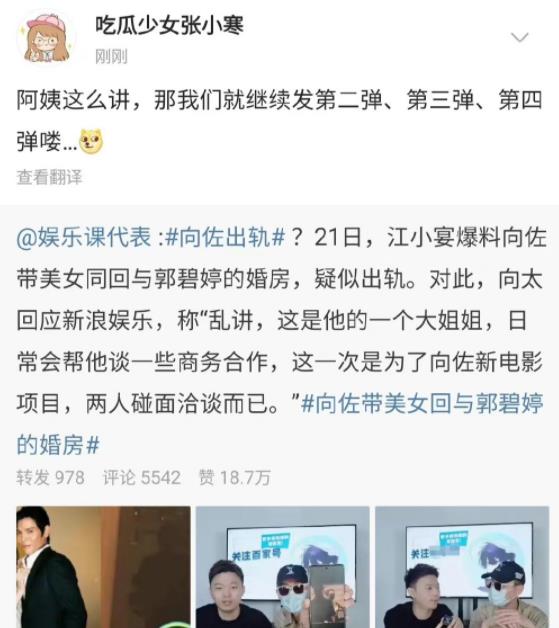 最近,向佐被曝光跟一醉酒女入住婚房一晚上,疑似出轨,而郭碧婷目前在台湾,还是哺乳期。在预告这个瓜的时候,大家本以为会是一个惊天大瓜,结果瓜出来后,网友调侃“无人伤亡”,以此来调侃向佐没有影响力。