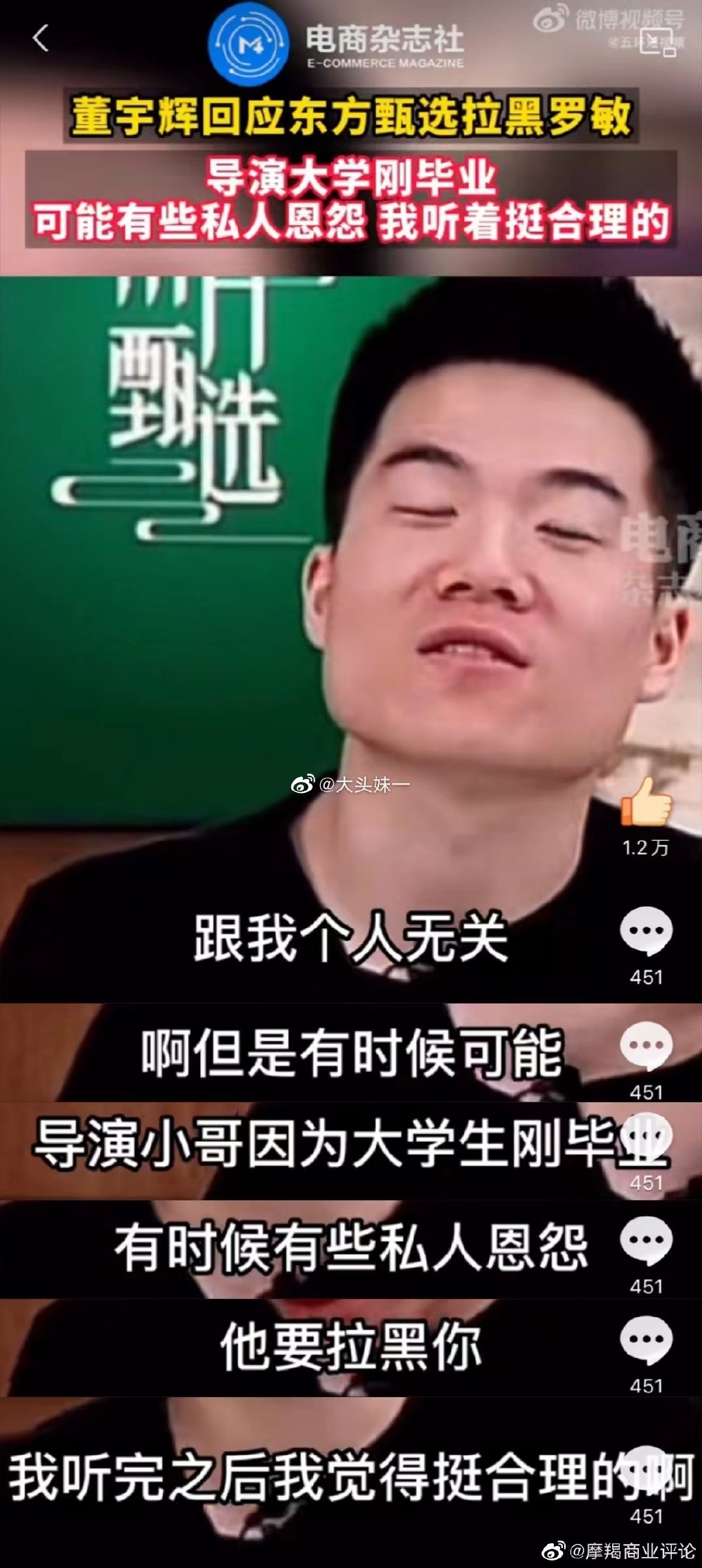 对此董宇辉在直播间解释:“东方甄选是公司的号,跟我个人无关。导演小哥因为大学刚毕业,有时候有些私人恩怨,他要拉黑,我听完之后觉得挺合理的。” 那么罗敏跟导演小哥有何个人恩怨呢??知道罗敏发家史的都知道,罗敏是靠校园贷起家的,在非你莫属的节目上,罗敏曾经被选手向炜狂怼,称其公司趣分期是在对一群没有收入来源的大学生从事放贷业务,刺激大学生们的攀比心理。而前些年,校园贷曾经曝出过很多丑闻,比如女大学生“裸条”事件、暴力催收事件等等,可能当代大学生很不喜欢罗敏这种靠校园贷发家的老板,这就是“私人恩怨”的根本原因。