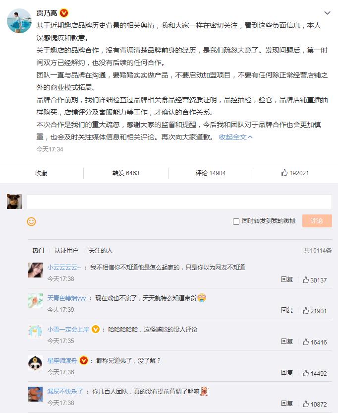 这个所谓的“私人恩怨”指的应该是这个刚毕业的导演小哥,看不惯罗敏的“趣分期”校园贷业务,当年校园贷曾经出现大面积的恶评,不少大学女生为了提前消费、攀比,不惜出卖自己的身体,用“裸条”的方式来借贷。所以不光是这位导演小哥看不惯,当年罗敏在上《非你莫属》的时候,还曾经被选手当场怼没“操守”。 ![]() 罗敏在直播的时候,还邀请了贾乃亮、傅首尔来助阵,在得知趣店过去的历史后,贾乃亮和傅首尔很快就宣布道歉,并停止继续合作。 贾乃亮在道歉声明中表示:“基于近期趣店品牌历史背景的相关舆情,我和大家一样在密切关注,看到这些负面信息,本人深感愧疚和歉意。关于趣店的品牌合作,没有背调清楚品牌前身的经历,是我们疏忽大意了。发现问题后,第一时间双方已经解约,也没有后续的任何合作。” ![]()
