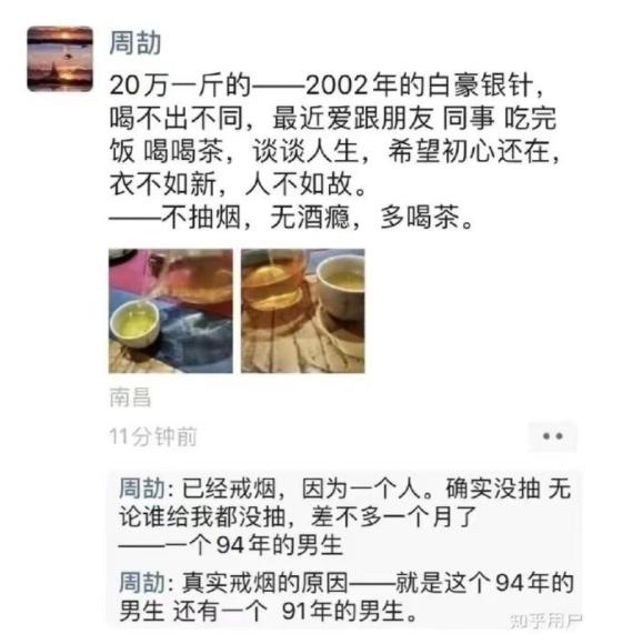 周劼(jie)朋友圈炫富事件发酵于7月24日,网传一位江西南昌男子周某在朋友圈炫富,炫富内容包括喝20万元一斤的茶叶,戴欧米伽手表、用苹果手机;还炫耀自己跟省领导见面,领导给其递烟,抽的是1200一条的烟...等等,下面是周劼朋友圈炫富的主要内容: