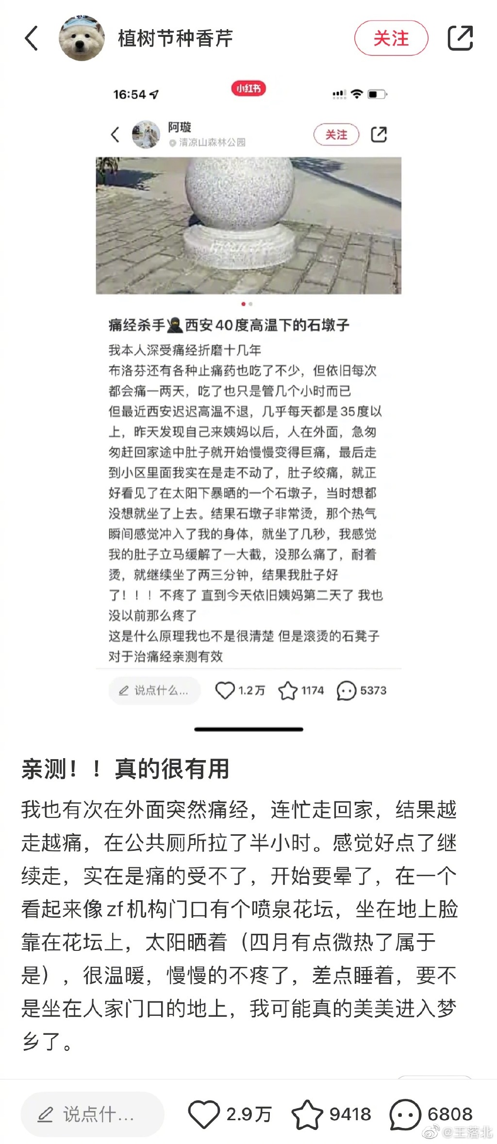 痛经杀手石墩子这个说法起源于7月5日在小红书上由@阿璇 发布的一条笔记,大致内容就是博主受痛经困扰十多年,一次意外发现,经过太阳暴晒后的石墩子有治疗痛经的效果。只需要坐在上面两三分钟,肚子就不疼了,而且第二天也没有以前那么疼了。