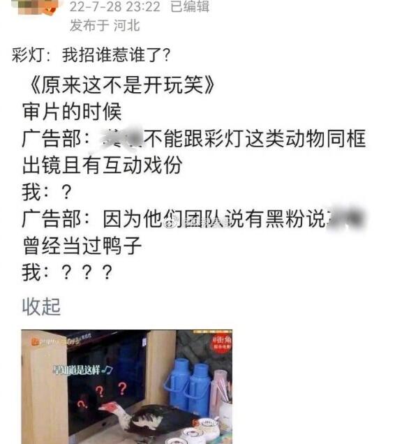 总之,彩灯作为一只鸭子没有惹到任何一个人!彩灯在12期13期的镜头为什么被删?目前无论是网友们还是节目组都没给出一个靠谱的答案。