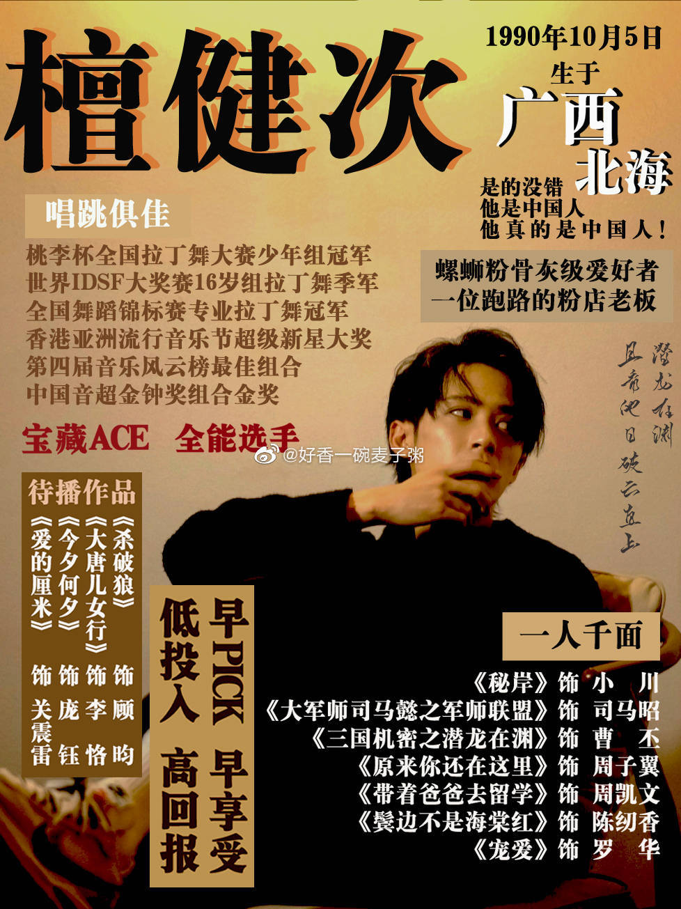 据悉,檀健次(JC-T)1990年10月5日出生于广西北海。舞者、歌手、演员。擅长拉丁舞,第八届“桃李杯”舞蹈比赛国际比赛标准舞16岁以下拉丁舞冠军,全国体育舞蹈锦标赛拉丁舞冠军、摩登舞第五名,世界IDSF大奖赛年度总决赛上海公开赛拉丁舞季军、摩登舞第四名(世界两大舞蹈赛事之一,与黑池齐名,含金量极高)。