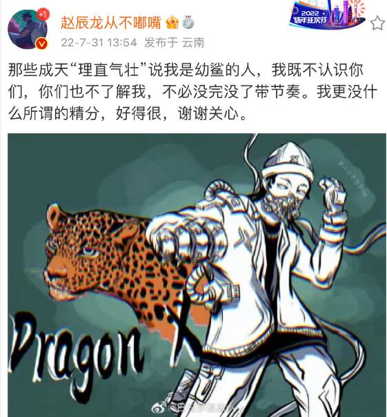 但是目前谁也没有实际证据能证明幼鲨到底是谁,而且赵辰龙本人也并没有承认,我更愿意相信他只是一个喜欢Hipho的普通人,从不暴露自己的真实身份。这是因为他是单纯喜欢饶舌而去唱,并不是为了名与利,在这点上几乎没有任何人做到。所以幼鲨的这个态度才更值得我们尊重和敬佩。