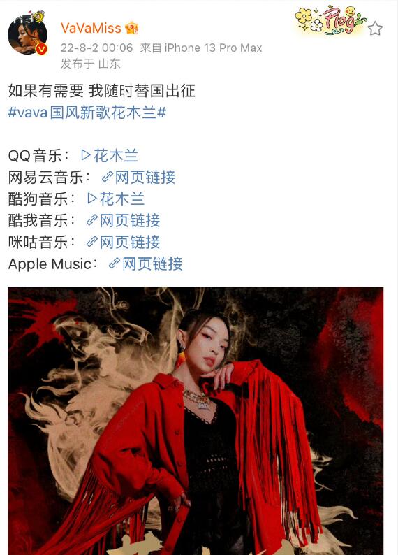 vava昨日带着新歌《花木兰》登上了微博热搜,但这次她又遭到不少网民的冷嘲热讽,主要原因是昨天恰逢老巫婆窜访,在这敏感时期vava发文说愿替国出征,下面还附上了自己的新歌,被网友指责什么都蹭,不懂审时度势,目前Vava的评论区已经关闭。
