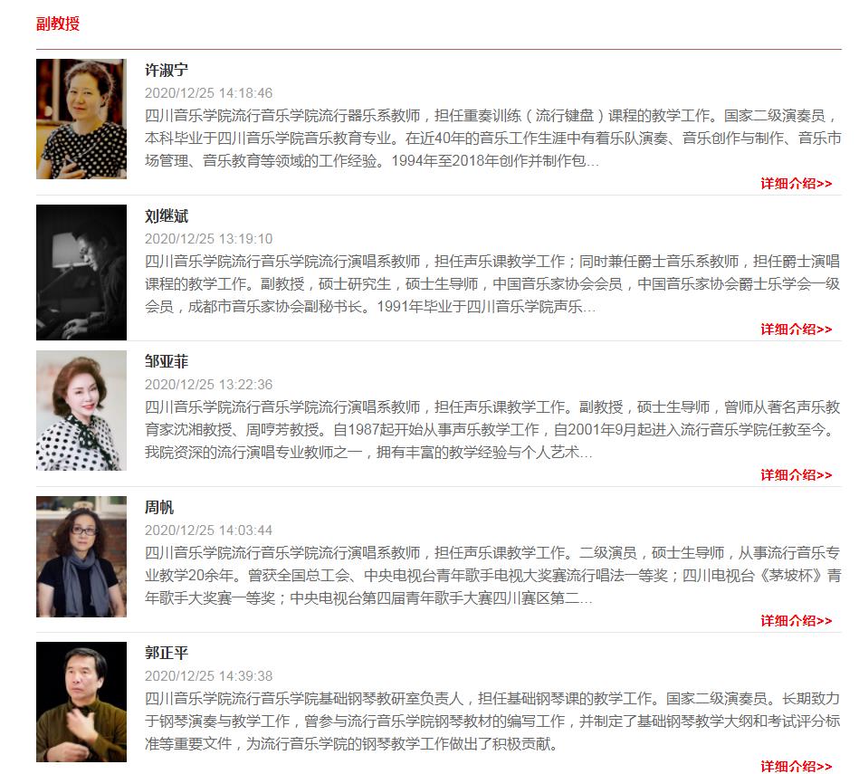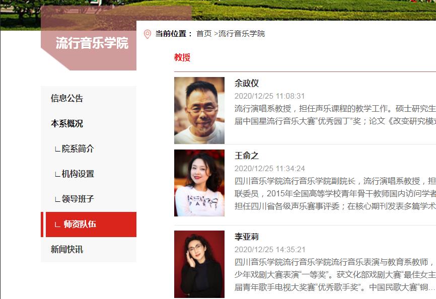 在师资队伍的教授栏目中,也没有看到谭维维和王铮亮的名字: ![]() 四川音乐学院流行音乐学院创立于2001年,学院下设流行演唱系、爵士音乐系、现代音乐制作系、流行器乐系、现代流行舞系、流行音乐表演与教育系6个专业系科,超过20个专业方向,并设有流行音乐研究所和流行音乐录音与后期母带实验室。人才培养涵盖专科、本科、硕士研究生3个学历层次。2020年,学院教师团队152人,在校学生总人数达到1246名,各专业方向开设流行音乐专业课程总数75门,其中多门课程属国内唯一开设,如:“流行和声”、“流行音乐风格分析”、 “流行音乐历史与风格”、“流行音乐节奏与律动”、“流行歌曲翻唱与改编”等。经过20年的探索与发展,学院培养的人才(李宇春、何洁等)在流行音乐领域取得了有目共睹的优异成绩,川音流行音乐学院已成为中国高等专业音乐院校中第一所建制完备的培养流行音乐高层次、应用型、研究型人才的院校。 ![]() 官网地址:http://www.sccm.cn/jx_lxyyxy.html |