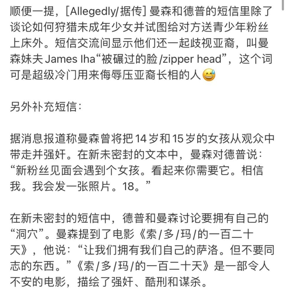 ![]() 另外根据曼森和德普的一个短信显示,曼森曾经在自己的演唱会上强奸过自己的女粉丝。据报道:曼森曾将把14岁和15岁的女孩从观众中带走并强奸。在新未密封的文本中,曼森对德普说:“新粉丝见面会遇到个女孩。看起来你需要它。相信我。我会发一张照片。18。” ![]() 这两天德普和曼森都冲上热搜了,起因是最近爆出他和德普的短信(16年左右的)里面他diss自己的日裔妹夫时用了歧视性词语zipper head(歧视亚洲人长相的言论)。曼球表示他的这个妹夫吃软饭,还想捞自己的钱 。短信里面觉得他和女友不和,不过后面他俩结婚了,现在也没离。这件事在经过网络上的发酵之后,成了德普rh....