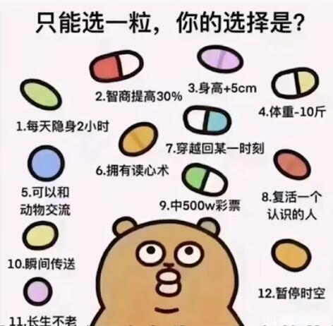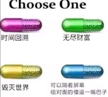之后诞生了许许多多的梗图,大多都是配上各种不同颜色的药丸,并标记上对应的不同的选项,让大家来选想吃那个药丸。