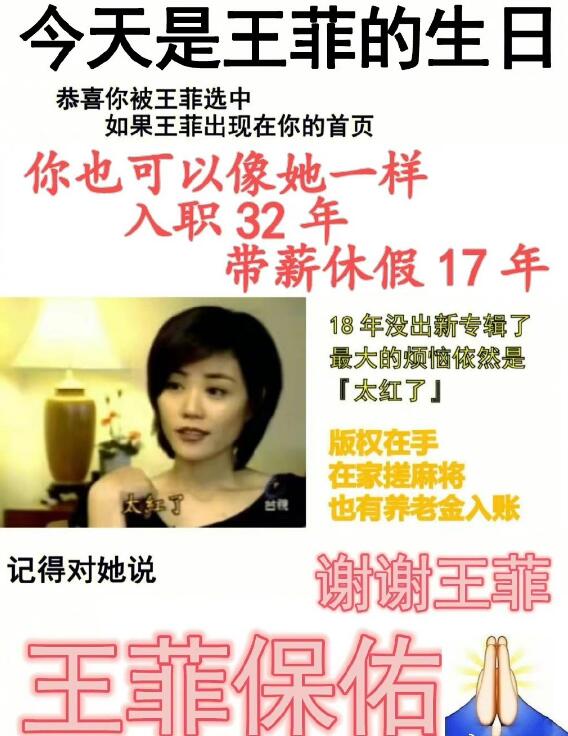 2022年8月8日,迎来了王菲53岁的生日,让她祝福大家可以工作入职32年里带薪休假17年,18年没出新专辑了最大的烦恼依然是太红了!记得对她说,谢谢王菲。