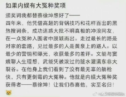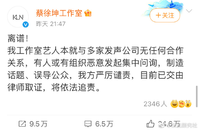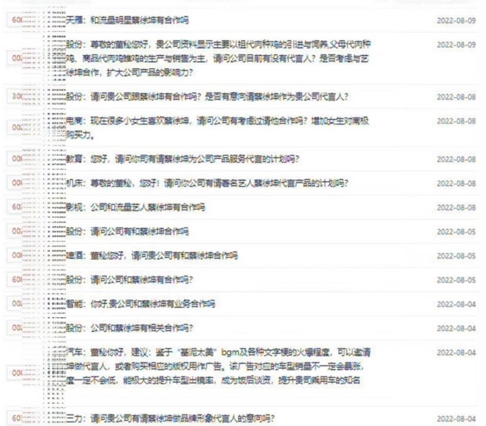 目前来看,纯粹就是一股有组织的网友,恶意到相关上市公司股吧留言区,进行大量的问询导致的,如下图: ![]() 什么叫占用公共资源?黑粉的这些行为就是,跑到毫不相干的上市公司投资者交流会恶意提问毫不相干的艺人,导致上市公司回复,引发多家营销号掐头去尾地造势上热搜第一。这就叫占用公共资源!所有网友和投资者都应该严厉谴责这种行为,如果这次用在蔡徐坤身上没有付出代价,以后这种上不了台面的阴招还有可能入侵更多专业领域,把更多毫不相干的地方搞得乌烟瘴气。 目前蔡徐坤方面已经回应此事,称:“离谱!我工作室艺人本就与多家发声公司无任何合作关系,有人或有组织恶意发起集中问询,制造话题、误导公众,我方严厉谴责,目前已交由律师取证,将依法追责。” ![]() 除了这件事,前段时间还发生过“蔡徐坤生日快乐”的事件,当时佩洛西窜访台湾,中天电视台在直播的时候,一群粉丝在直播间里祝蔡徐坤生日快乐...详情:http://www.96845.com/article/2022/2131.html. 所以网友觉得蔡徐坤就是内娱的大冤种... ![]() |