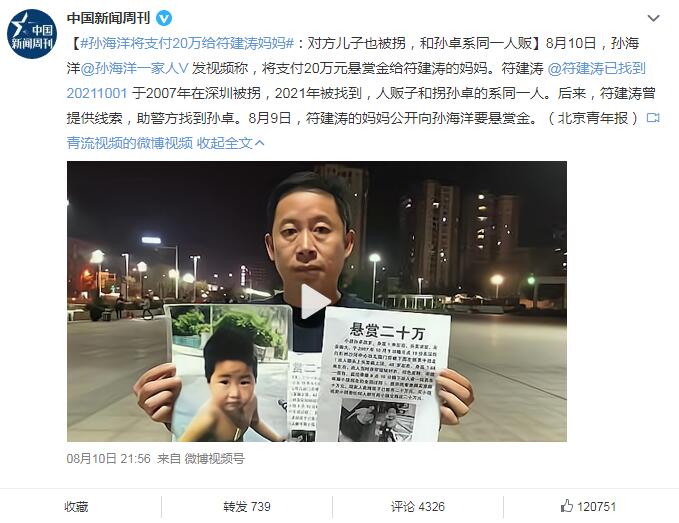 近日,孙海洋发视频称 ,将支付20万元悬赏金给符建涛妈妈,此事在全网嫌弃轩然大波,有网友认为,悬赏是给帮助提供线索的路人,同一个寻亲团队里面的受害者父母是资源信息共享的,在寻亲过程中互相帮忙寻找孩子,这是一个抱团取暖的互助团体,因此不应该再要这笔钱。也有网友认为,找到孙卓是警方的努力的必然结果,和符建涛并无直接关系,今天就来讲讲孙海洋事件的来龙去脉。